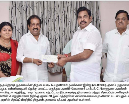 Read Moreகன்னியாகுமரி கிழக்கு மாவட்ட மருத்துவரணி செயலாளர், அருமை அண்ணன் Dr. C.N. Rajadurai கஜா புயலால் பாதித்த மக்களுக்கு நிவாரணமாக ரூபாய் 10,00000/- (பத்து லட்சம் ரூபாய்) வழங்கினார்.