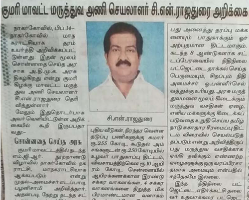 Read Moreஅம்மா அரசின் சாதனை - குமாரி மாவட்ட மருத்துவ அணி செயலாளர் சி.என். ராஜதுரை.