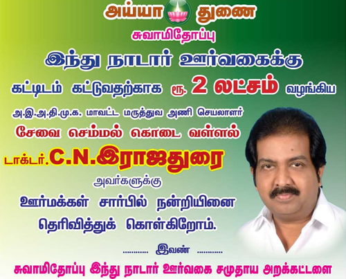 Read Moreசமாதானபுரம் இந்து நாடார் சமுதாய ஊர்வகை முத்தாரம்மன் கோவில் திருப்பணிக்காக ரூபாய் ஒரு லட்சத்திற்கான காசோலையை டாக்டர் C .N இராஜதுரை அவர்கள் ஊர் தலைவர் லெட்சுமணன் அவர்களிடம் வழங்கியபோது எடுத்த படம்.