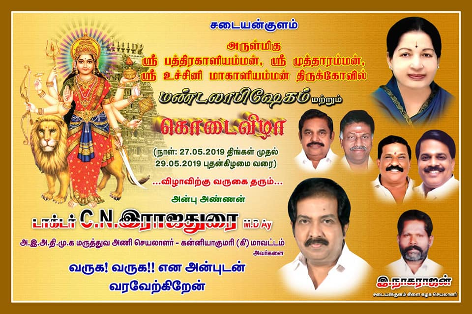 Steven Job Politics, News 18 Sep, 2018 சடையன்குளம் அருள்மிகு பத்திரகாளி அம்மன், ஸ்ரீ முத்தாரம்மன், ஸ்ரீ உச்சி மாகாளியம்மன் திருக்கோவில் மண்டலாபிஷேகம் விழாவிற்கு வருகை தந்த குமரி மாவட்ட மக்களின் எழுச்சி நாயகன், குமரி மாவட்ட தொழிலதிபருமான Dr .C.N இராஜதுரை அவர்களை வரவேற்றபோது #Dr. C.N இராஜதுரை #C.S.I #இந்து #கோவில் Leave a Reply Your email address will not be published. Name (optional) Email (optional) Comment